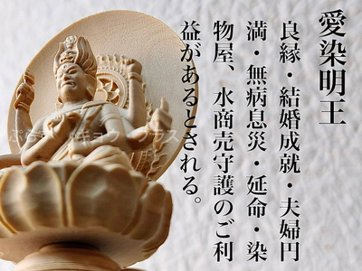 「恋愛・縁結び・家庭円満」などを司る仏として古くから信仰されている。また「愛染」=「藍染」と解釈され、染め物、織物職人の守護仏として、さらに愛欲を否定しないことから水商売の女性の信仰対象にもなっている。