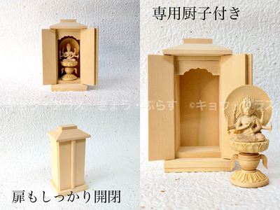 ミニサイズの仏像と専用の厨子のセットになります。軽量でコンパクトな仏像はどこでも祈りの空間を創り出してくれます。専用の厨子にてお祀りいただけます。