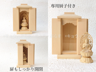 ミニサイズの仏像と専用の厨子のセットになります。軽量でコンパクトな仏像はどこでも祈りの空間を創り出してくれます。専用の厨子にてお祀りいただけます。