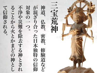 日本特有の仏教における信仰対象の一つ。仏教における仏法僧の三宝を守る神様とされる。日本仏教信仰の中で独自に発展した尊像。三面六臂または八面六臂(三面の頭上に五つの小面を持つ)で、頭髪を逆立てて目をつり上げた忿怒の表情を示す。不浄や災難を除去する神とされることから火と竈の神様として信仰される。