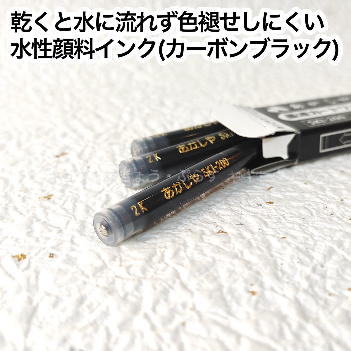 水性顔料インク(カーボンブラック)を使用しており、筆跡は乾くと水に流れず色あせしにくいため、長期保存にも適します。
