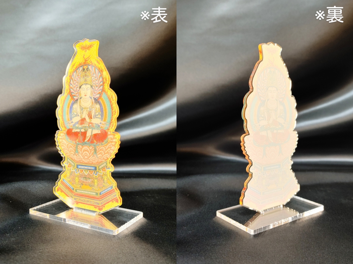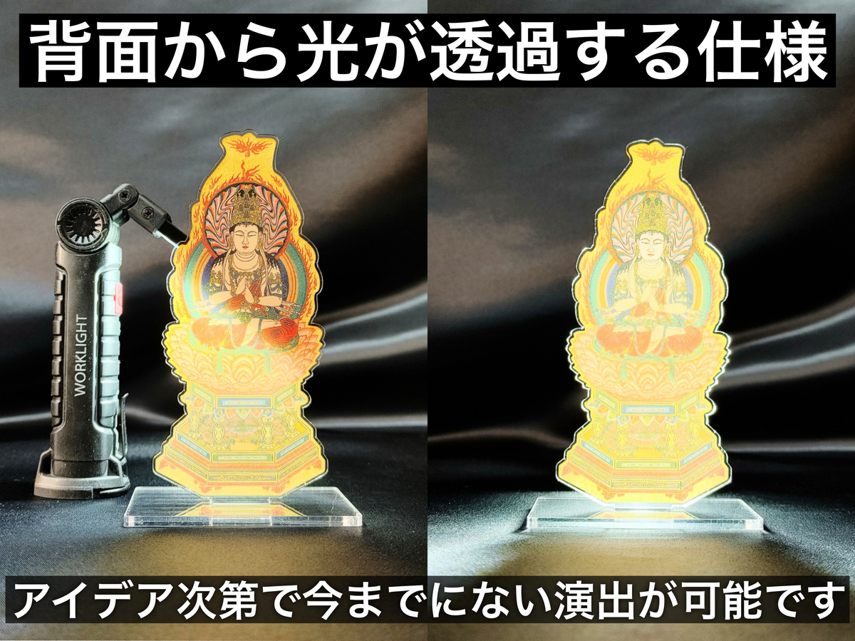 ありそうでなかった仏様のアクリルスタンド。デスク周りに置くのもヨシ。心の落ち着く場所に置くのもヨシ。もちろんサイズもコンパクトなので持ち運びも◎。また、こちらのアクリルスタンドは背面からの光を透過してくれます。様々な演出で仏様をより荘厳に、よりカジュアルに、お好きなスタイルで飾れます。