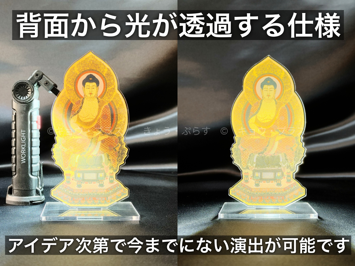 ありそうでなかった仏様のアクリルスタンド。デスク周りに置くのもヨシ。心の落ち着く場所に置くのもヨシ。もちろんサイズもコンパクトなので持ち運びも◎。また、こちらのアクリルスタンドは背面からの光を透過してくれます。様々な演出で仏様をより荘厳に、よりカジュアルに、お好きなスタイルで飾れます。