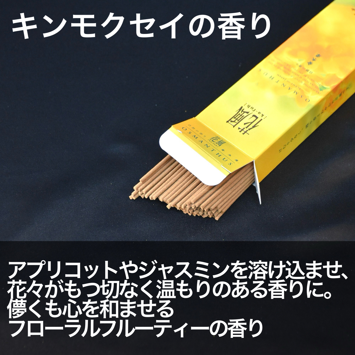 ・キンモクセイ…アプリコットやジャスミンを溶け込ませ花々がもつ切なく温もりのある香りに。儚くも心を和ませるフローラルフルーティの香り。煙かなり少ない。