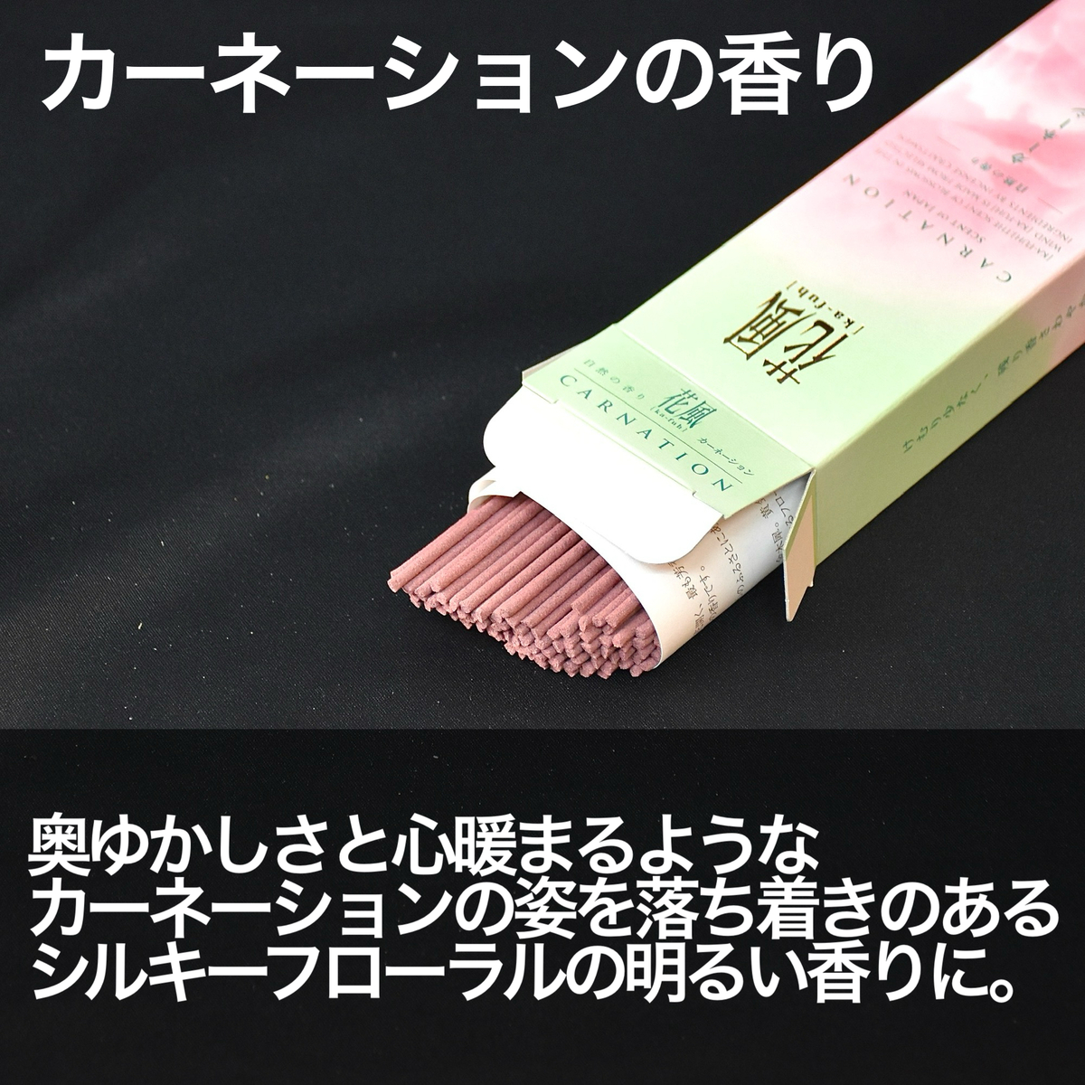 ・カーネーション…奥ゆかしさと心温まるようなカーネーションの落ち着きのあるシルキーフローラルの明るい香り。煙かなり少ない。