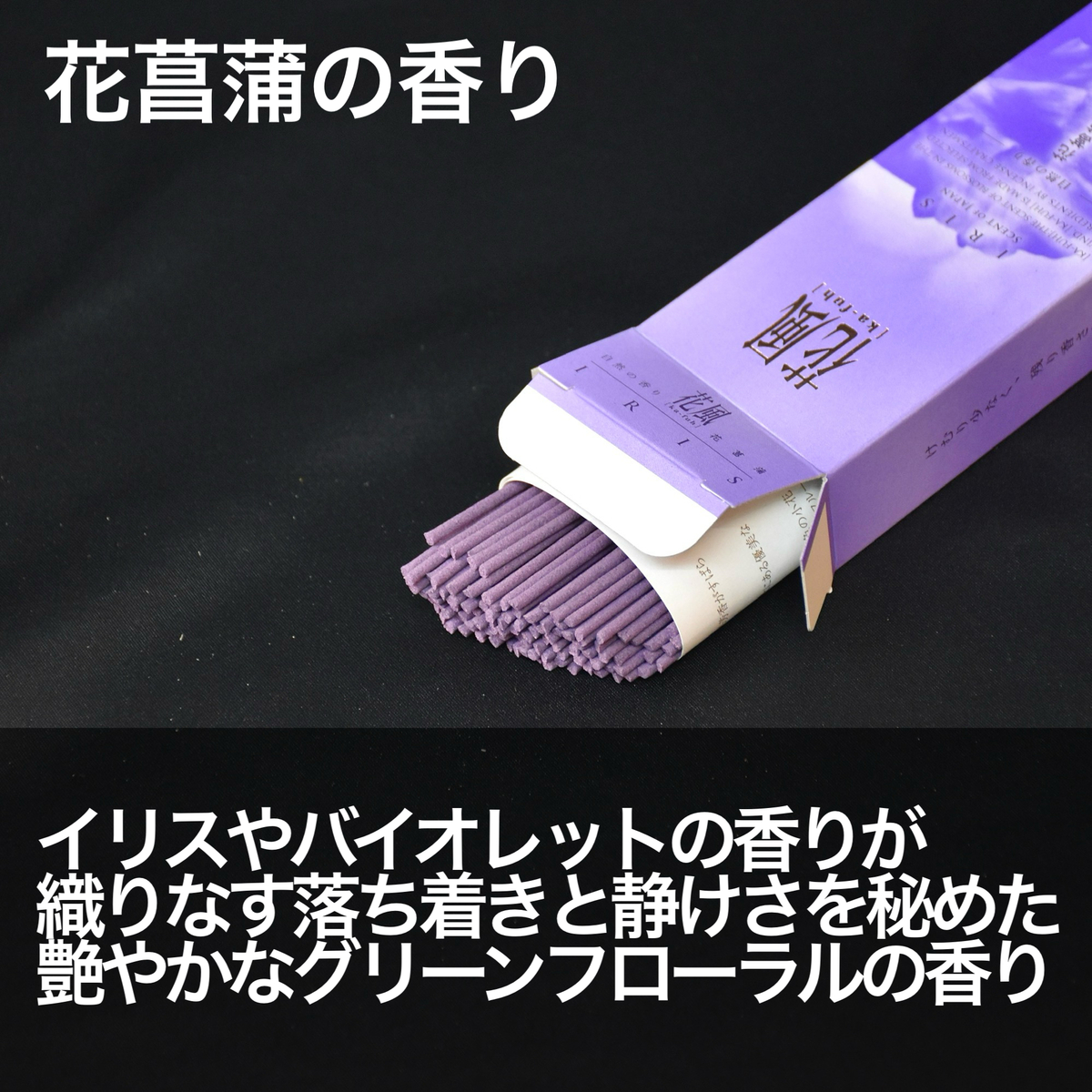 ・花菖蒲…イリスやバイオレットの香りが織りなす落ち着きと静けさを秘めた艶やかなグリーンフローラルの香り。煙かなり少ない。